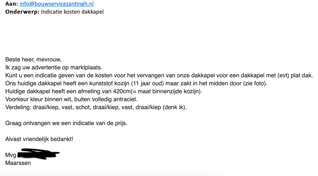 Traditionele dakkapellen zijn bij ons de standaard, bij Dakkapellen Drenthe besteden we veel aandacht aan de constructie. Voordat we een gat in je dak maken, evalueren we zorgvuldig de bestaande dakconstructie. We krijgen vaak een bericht van een klant om de ‘ingezakte kant-en-klare’ dakkapel te vervangen. Hieronder heb ik de mail met bijbehorende foto bijgevoegd.